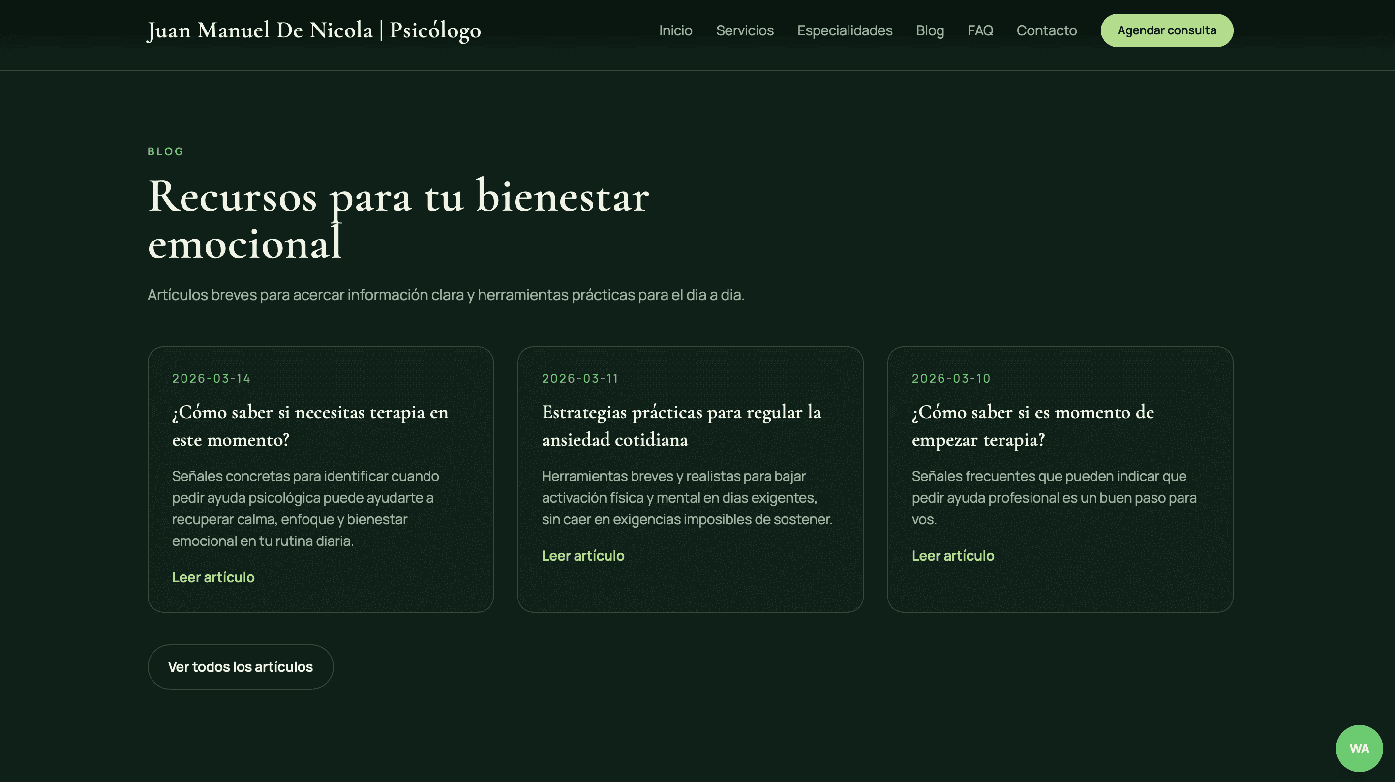Este proyecto consistió en el diseño y desarrollo de una página web tipo blog para un psicólogo, pensada como un espacio de comunicación directa con potenciales pacientes. La web combina contenido educativo con una estructura clara de servicios, buscando posicionar al profesional como una referencia confiable en su área y facilitar el primer contacto.