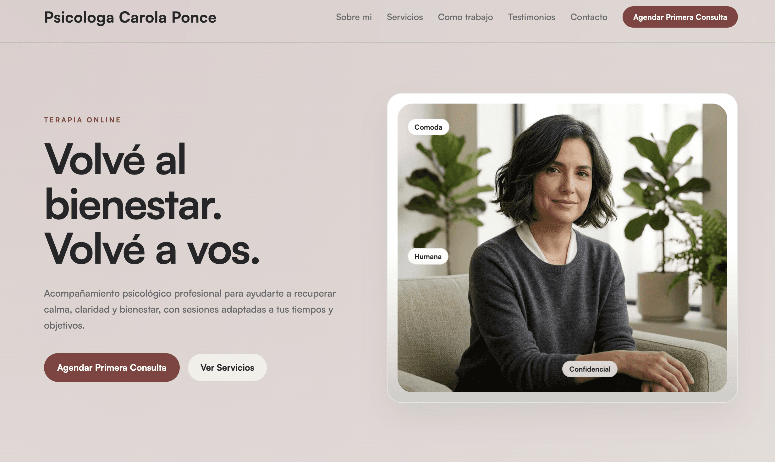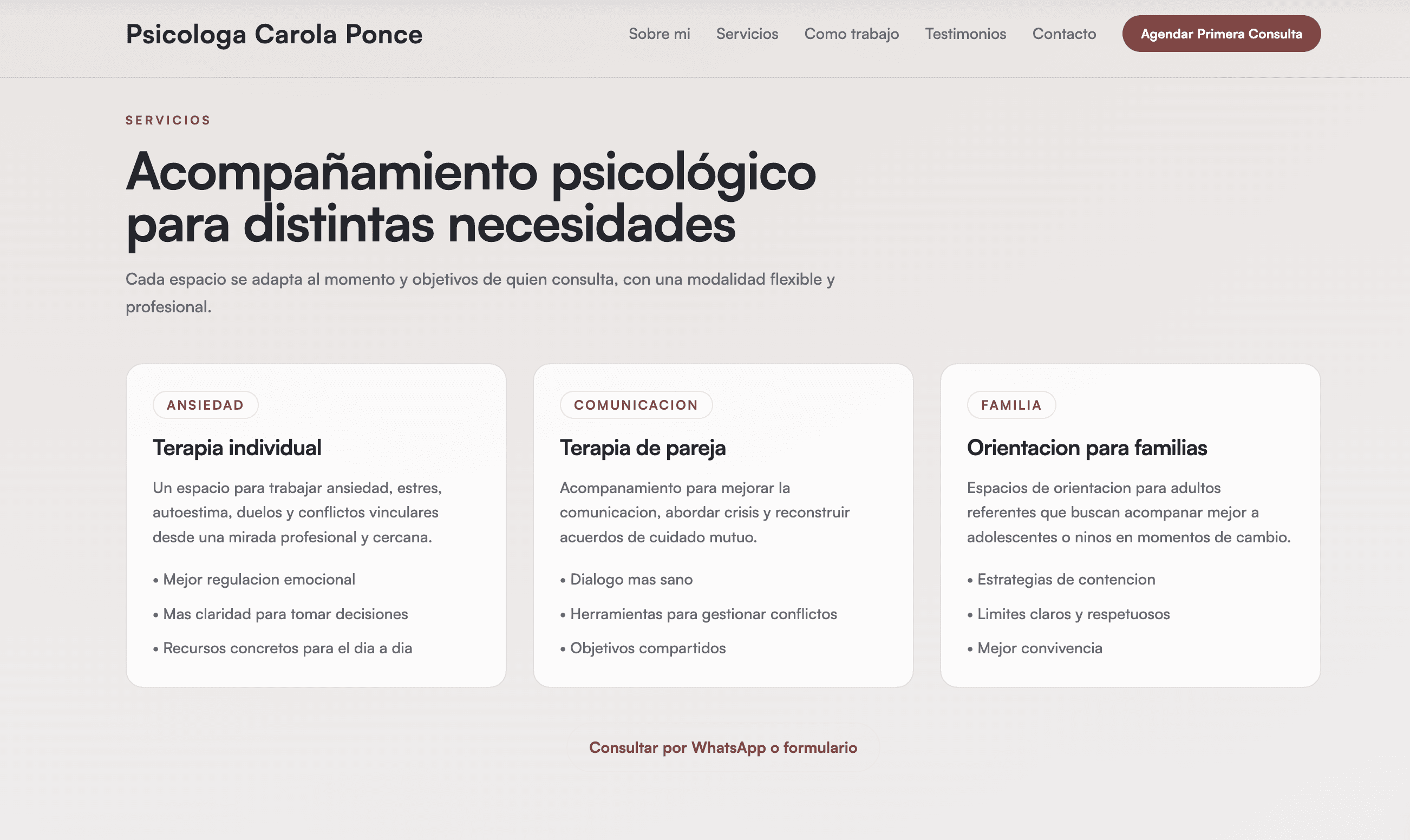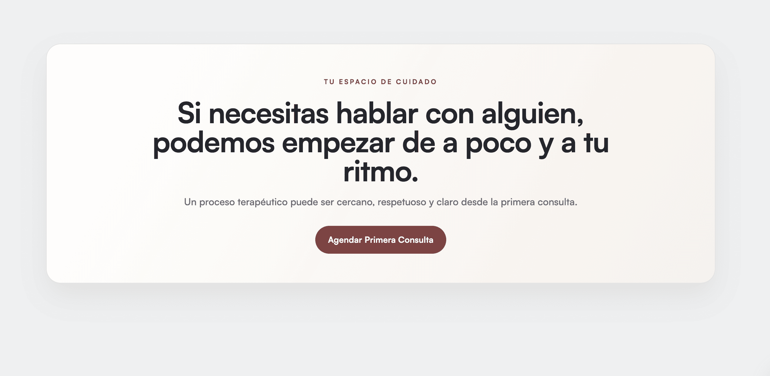 Este proyecto consistió en el diseño y desarrollo de una landing page para un psicólogo, enfocada exclusivamente en la captación de nuevos pacientes. A diferencia de un sitio web tradicional, la página está pensada como una experiencia directa, donde toda la información guía al usuario hacia una única acción: agendar una consulta.