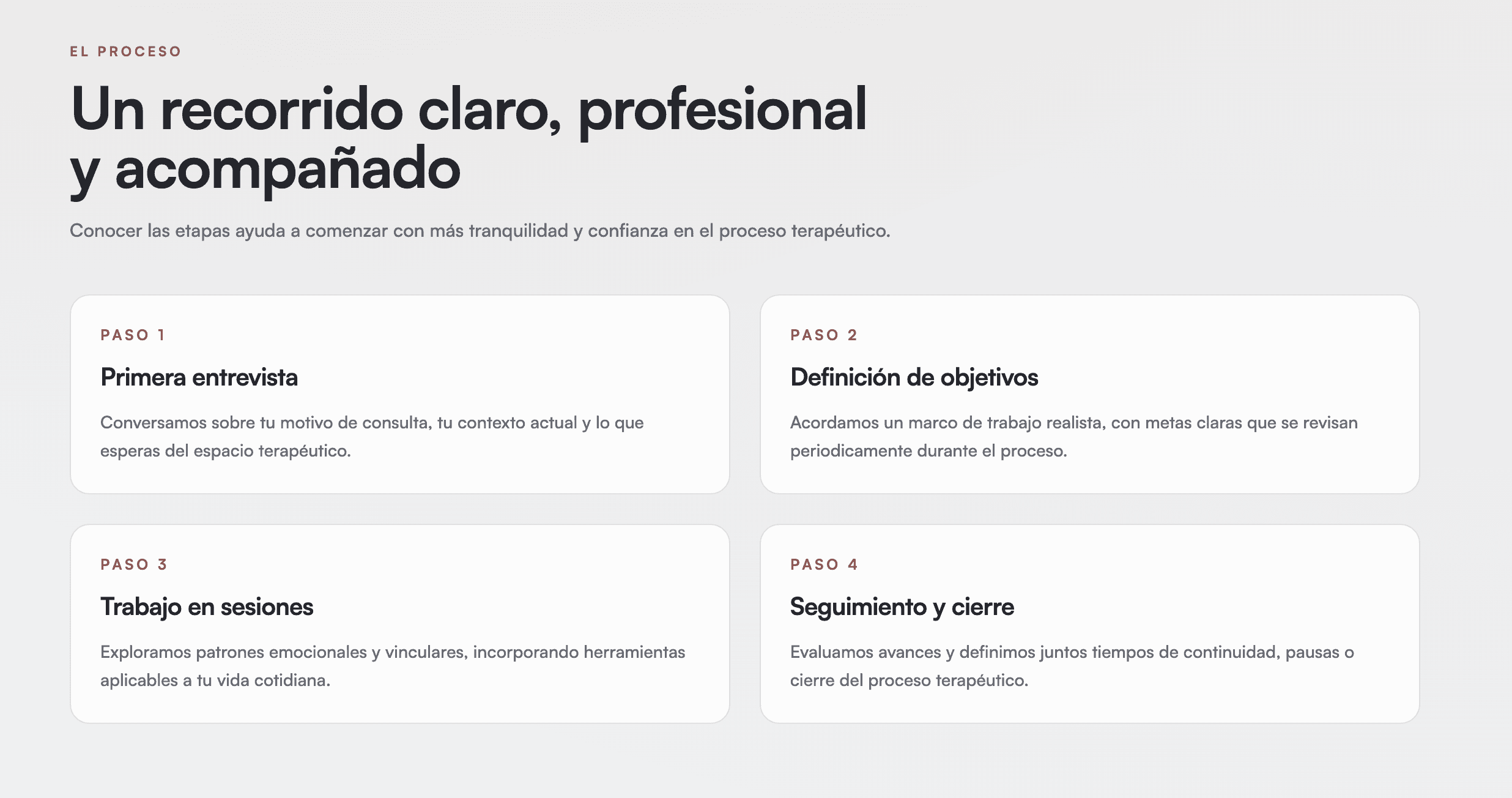 El proceso comenzó definiendo el mensaje principal del profesional y su propuesta de valor. A partir de esto, se estructuró una landing en formato one-page, donde cada sección cumple una función específica dentro del recorrido del usuario: presentación, credibilidad, servicios y contacto.